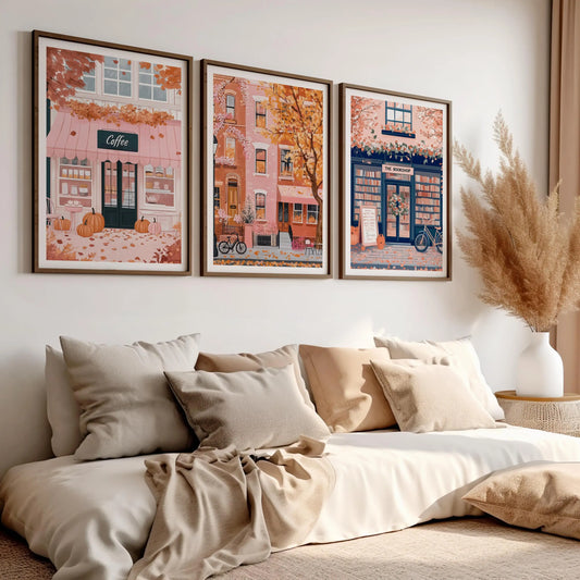 3PC Autumn Wall Art Decor, Coffee Poster, Pink Wall Art, Autumn Bookshop, Fall Decor City Poster, Cottage Core, Pumpkin Wall Art
