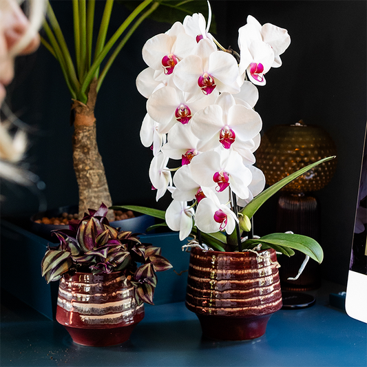 Pflanzenset Bamboo Weiß – weiße Amabilis Orchidee Ø9cm + Grünpflanze inkl. Keramik-Übertöpfe – blühende Zimmerpflanze frisch vom Züchter – 2–3 Stiele