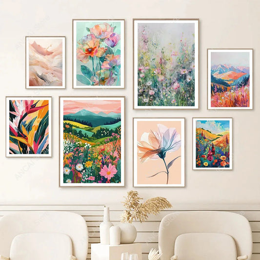 Abstract Illustration Art Distant Mountain Flowers Colorful Nature Landscape Posters Wall Art Canvas Painting Nordic Room Decor