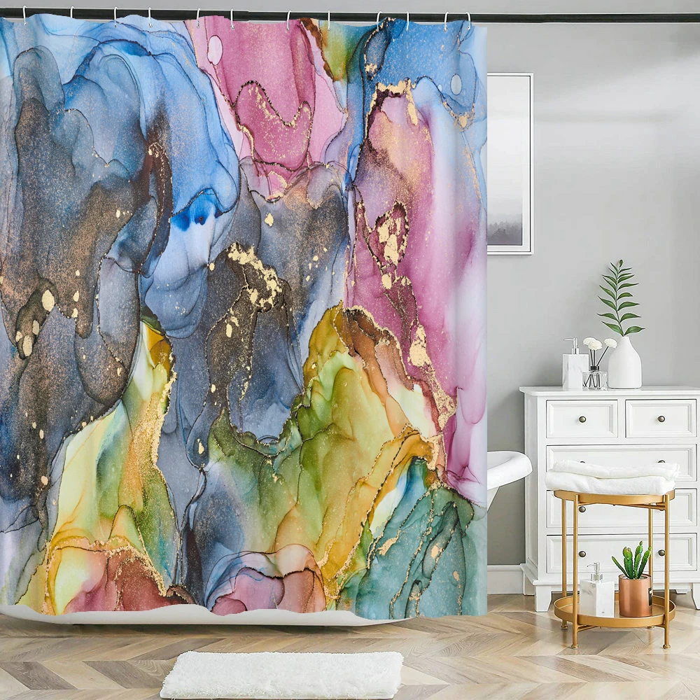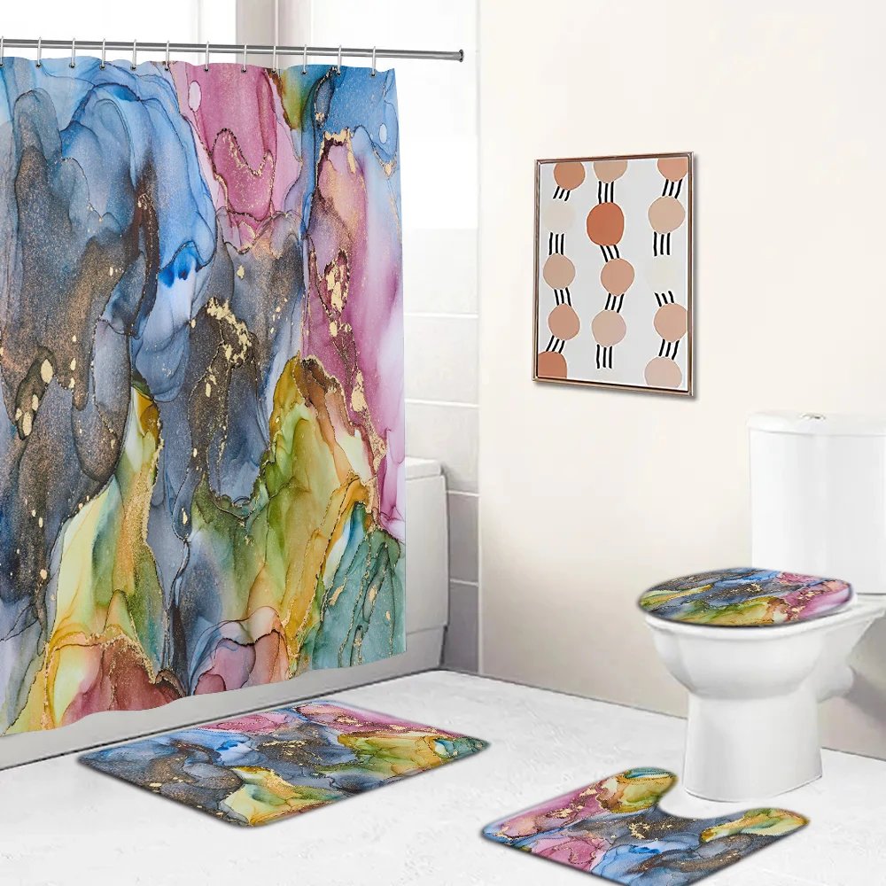 Colorful Golden Abstract Marble Print 3D Shower Curtain Waterproof Bathroom Curtain Anti-slip Bath Mat Set Toilet Rug Carpet
