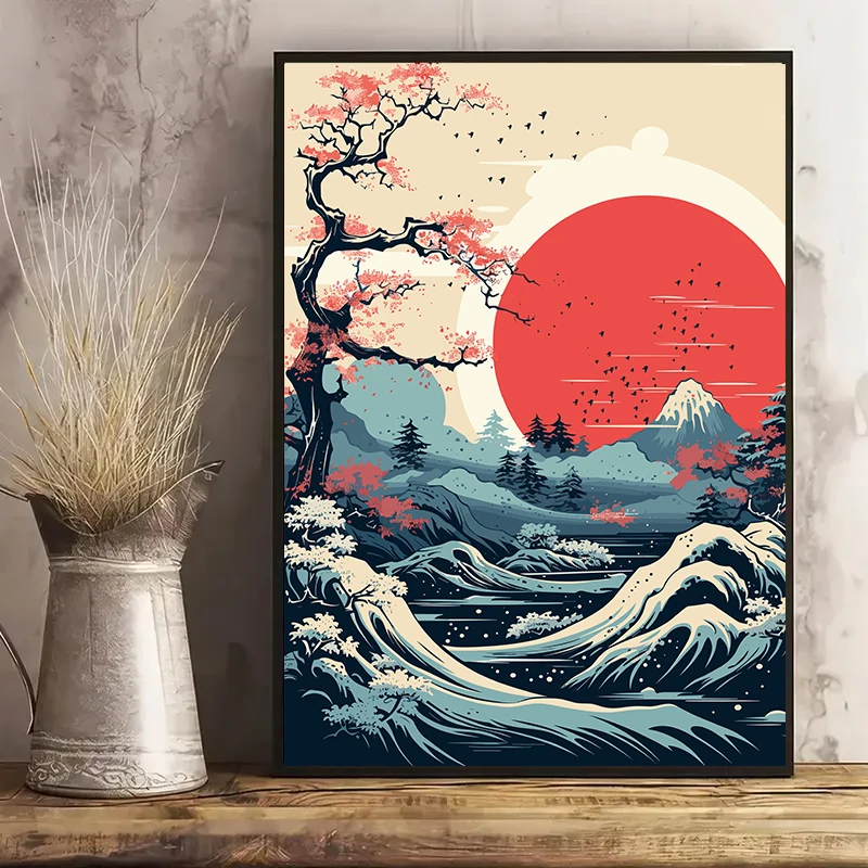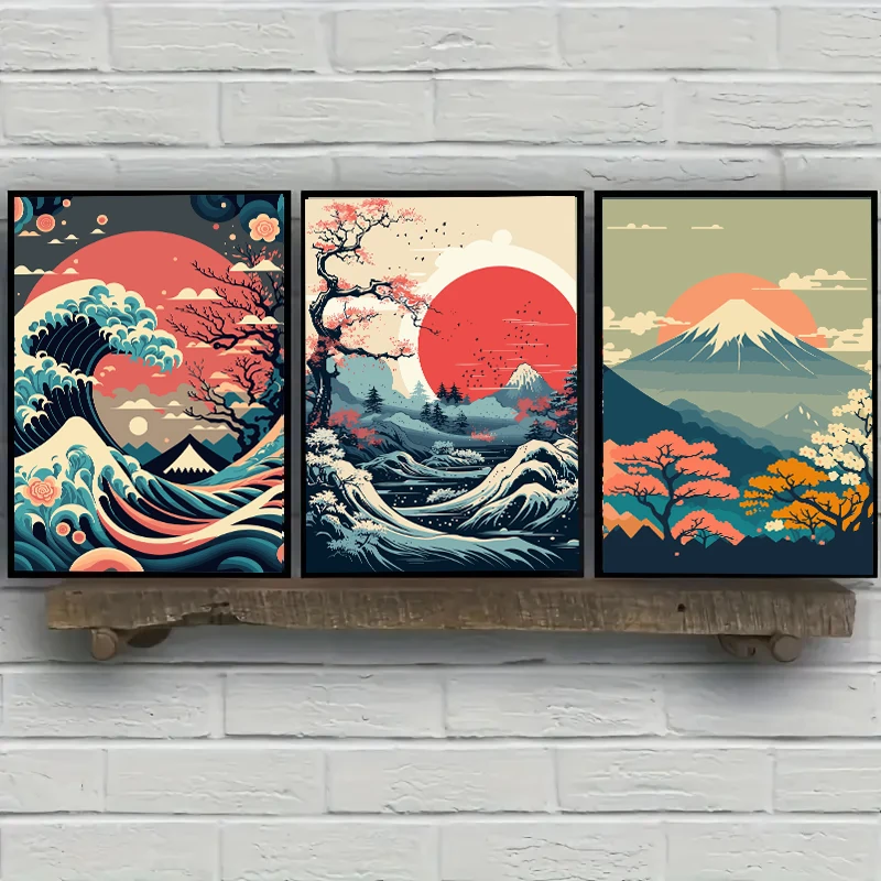 Set of 3 Japanese Vintage Art Unframed Canvas Painting Mountain Sea Sunset Nature Landscape Wall Art Autumn Gallery Poster